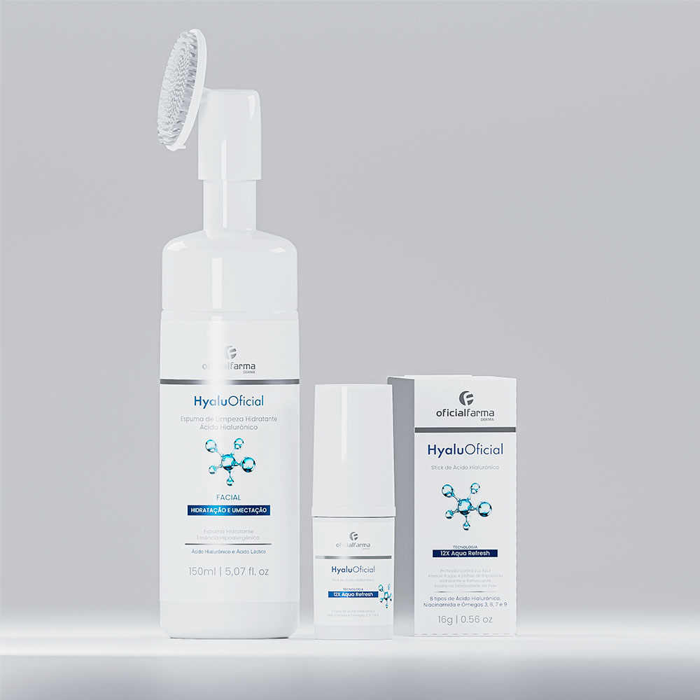 Uma solução prática e completa para o cuidado diário da sua pele. Combinando a ação de limpeza suave da HyaluOficial Espuma de Limpeza Hidratante com o efeito hidratante e preenchedor do HyaluOficial Stick de Ácido Hialurônico, esse kit promove uma pele limpa, hidratada e revitalizada desde a primeira aplicação.