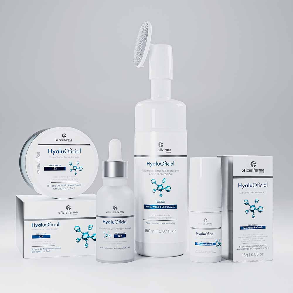 O Kit Completo HyaluOficial combina a ação de limpeza da Espuma Hidratante, o efeito lifting do Sérum Volumizador 12X, o tratamento pontual do Stick de Ácido Hialurônico, e a ação reestruturante profunda do Creme Preenchedor Facial 12X. Juntos, esses quatro produtos formam a solução perfeita para uma pele mais jovem, firme e hidratada.