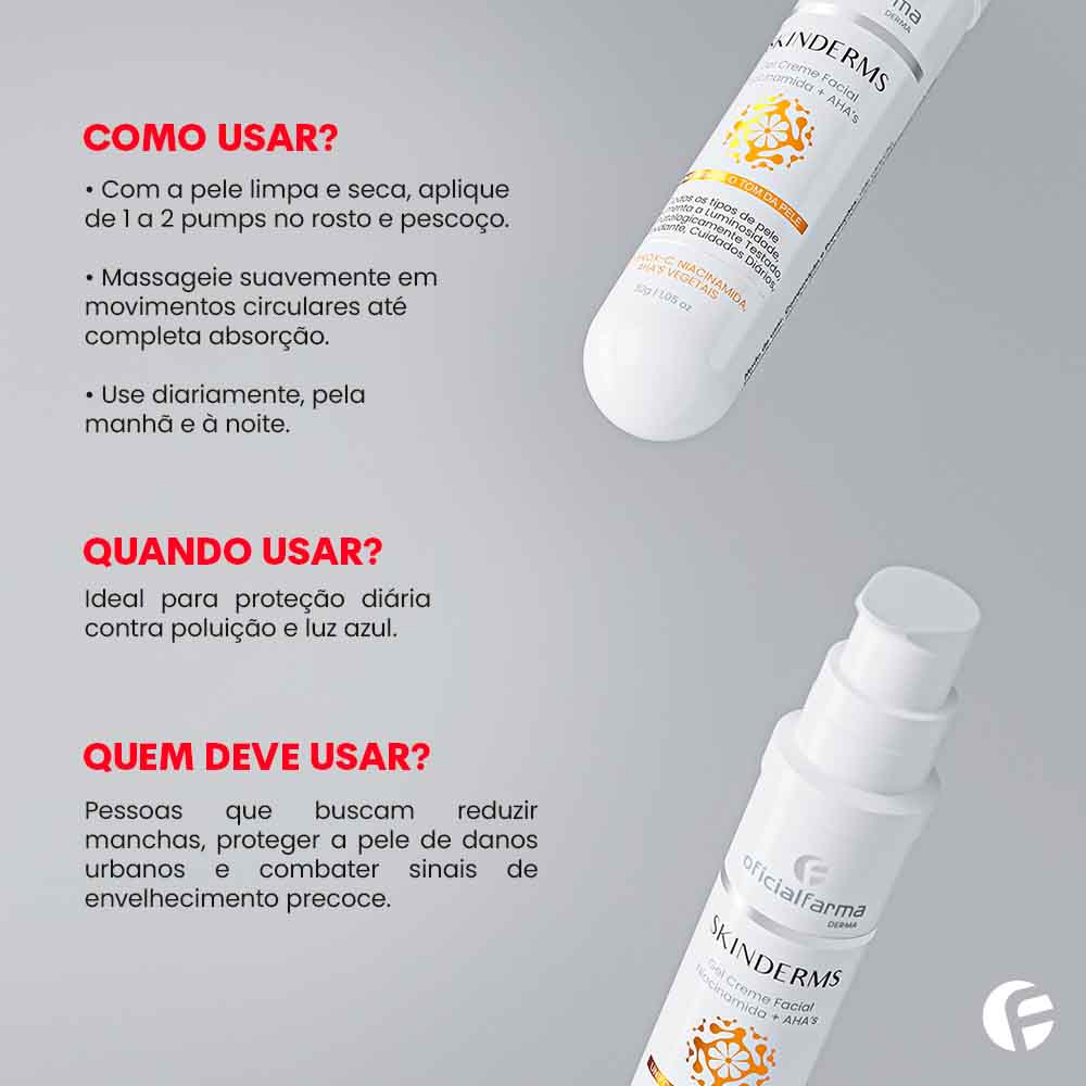 Com a pele previamente higienizada e seca, aplicar de 1 a 2 pumps de SKINDERMS C B3 + AHA’s sobre a face e pescoço com movimentos circulares até completa absorção.